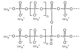 Crystal phase I APP (APP I) is characterized by a variable linear chain length, showing a lower decomposition temperature (aprox 150°C ) and a higher water solubility than Crystal Phase II Ammonium Polyphosphate. The general structure of APP is given below.